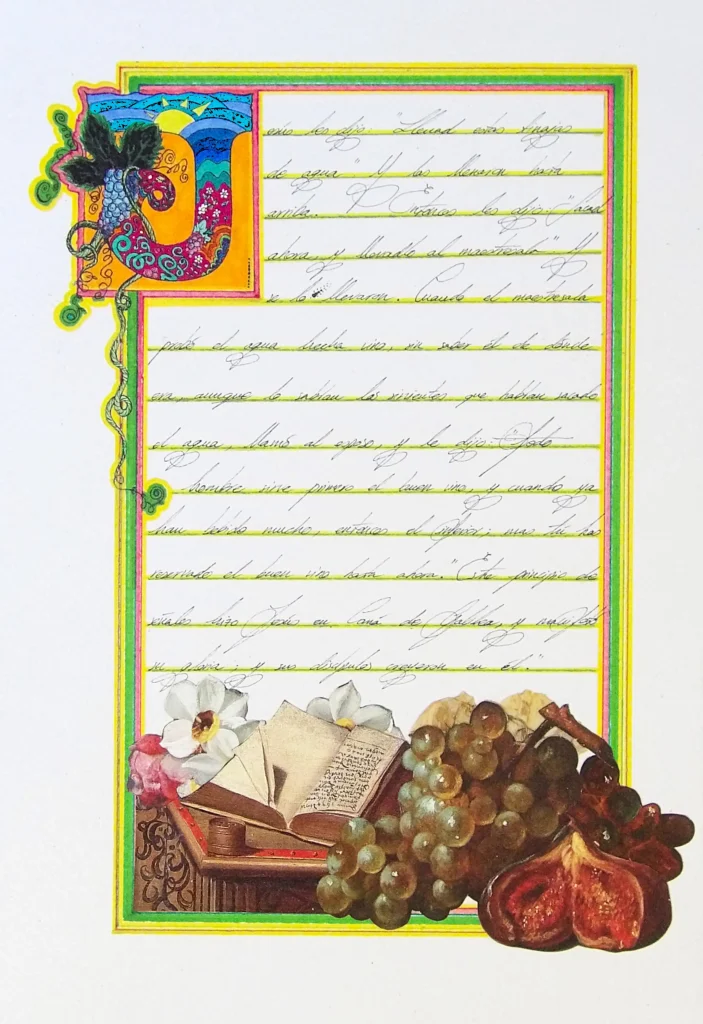 Manuscrito iluminado que relata el pasaje de las bodas de Caná, decorado con imágenes de alimentos, en el que predominan las imágenes de uvas y parras.