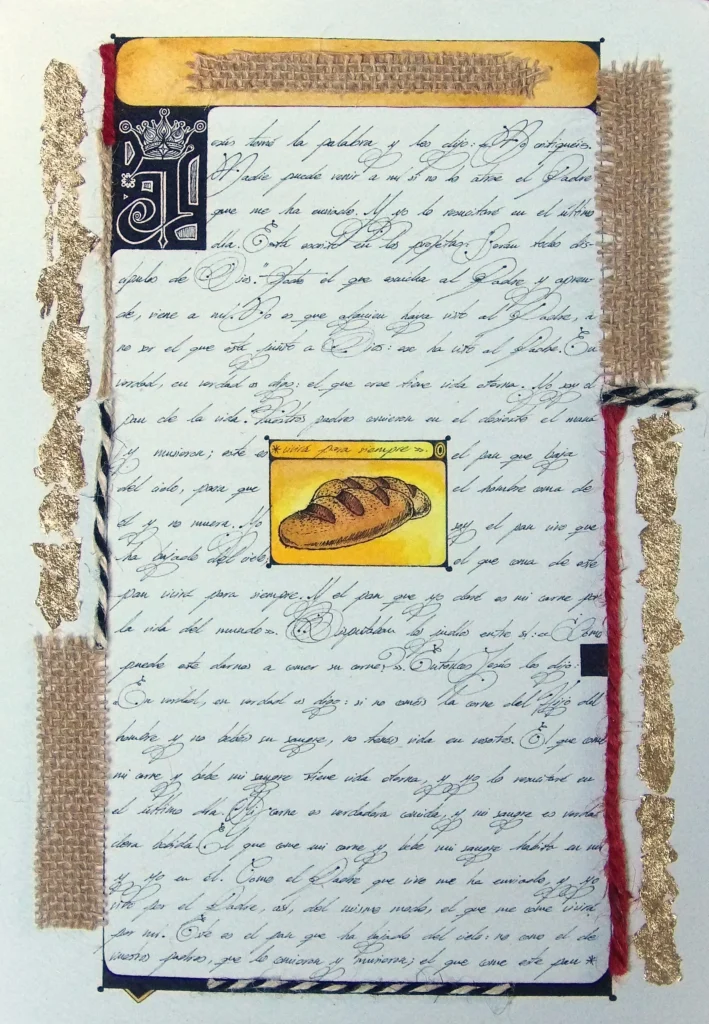 Lámina manuscrita iluminado que contiene parte del discurso de El Pan de Vida, recogido por el Evangelista Juan.