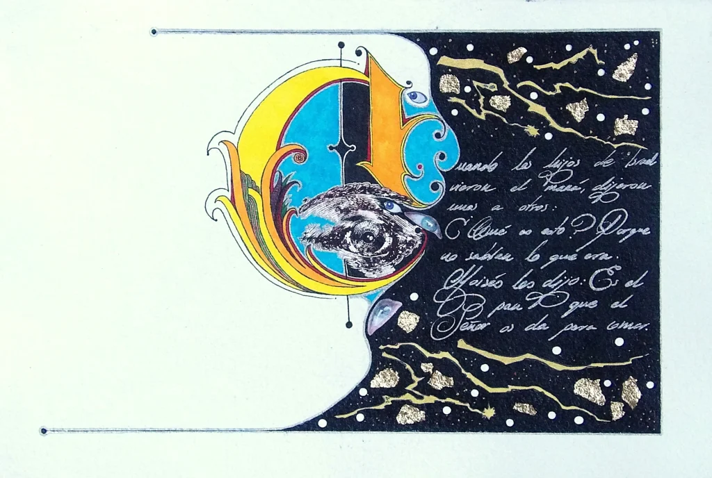 Manuscrito artístico del momento en el que Dios envía el maná a su pueblo cuando este está sufriendo el hambre en el desierto (Éxodo 16, 15).