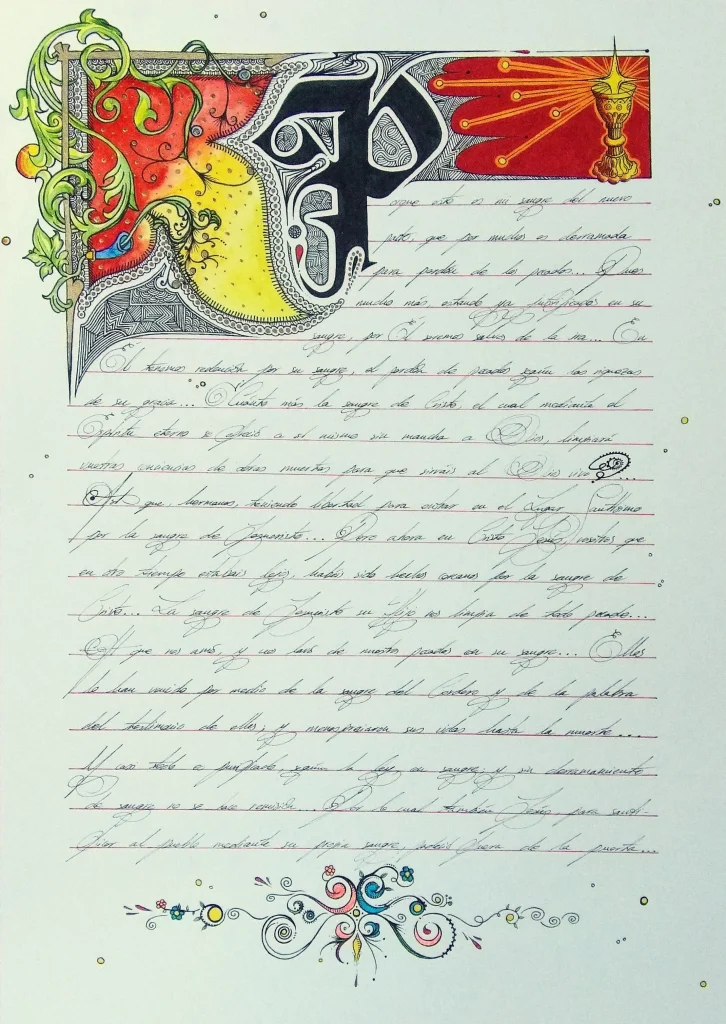 Lámina iluminada que contiene varios pasajes del Nuevo Testamento que giran en torno al sacrificio salvífico de Cristo (Mt 26, 28; Ef 1, 7; 2, 13; Rom 5, 9; Heb 9,14; 10, 19; 9, 22; 13, 12; Jn 1, 7; Ap 1, 5; 12; 11).