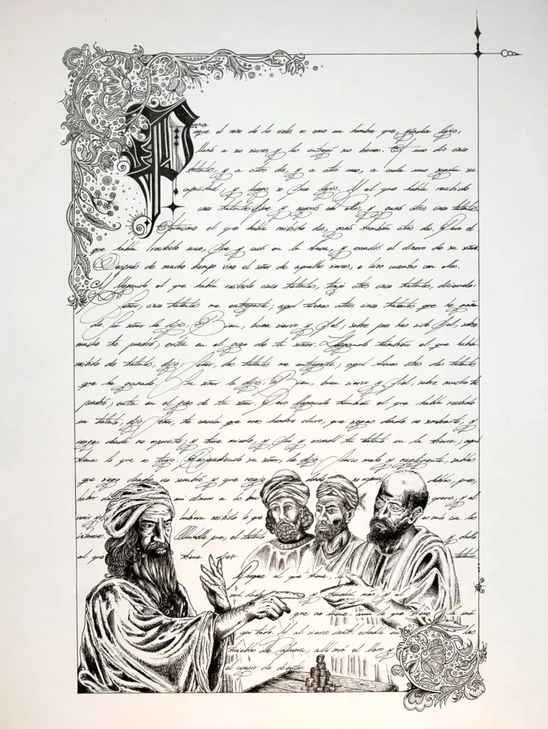 Lámina manuscrita ilustrada con la parábola con la que Cristo trata de explicar a sus discípulos el Reino de Dios, recogida en Mateo 25, 14-30. Decorado con una letra iluminada en blanco y negro, con ornamentos florales y una escena de la parábola retratada que emerge desde el texto.